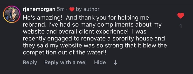I’ve had so many compliments about my website and overall client experience! I was recently engaged to renovate a sorority house and they said my website was so strong that it blew the competition out of the water!!
